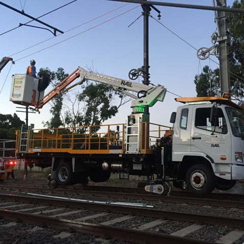 All Access construction work. The basket is oversized to allow for multiple operators and equipment required for new overhead installations.